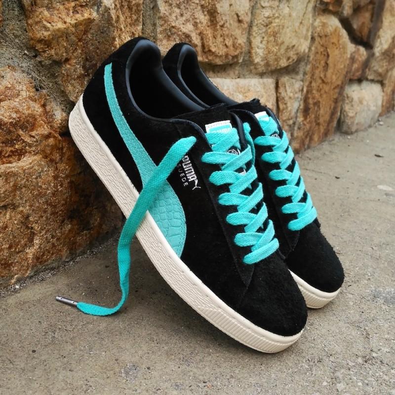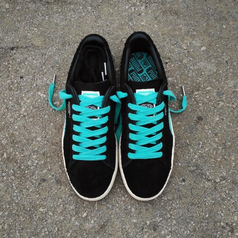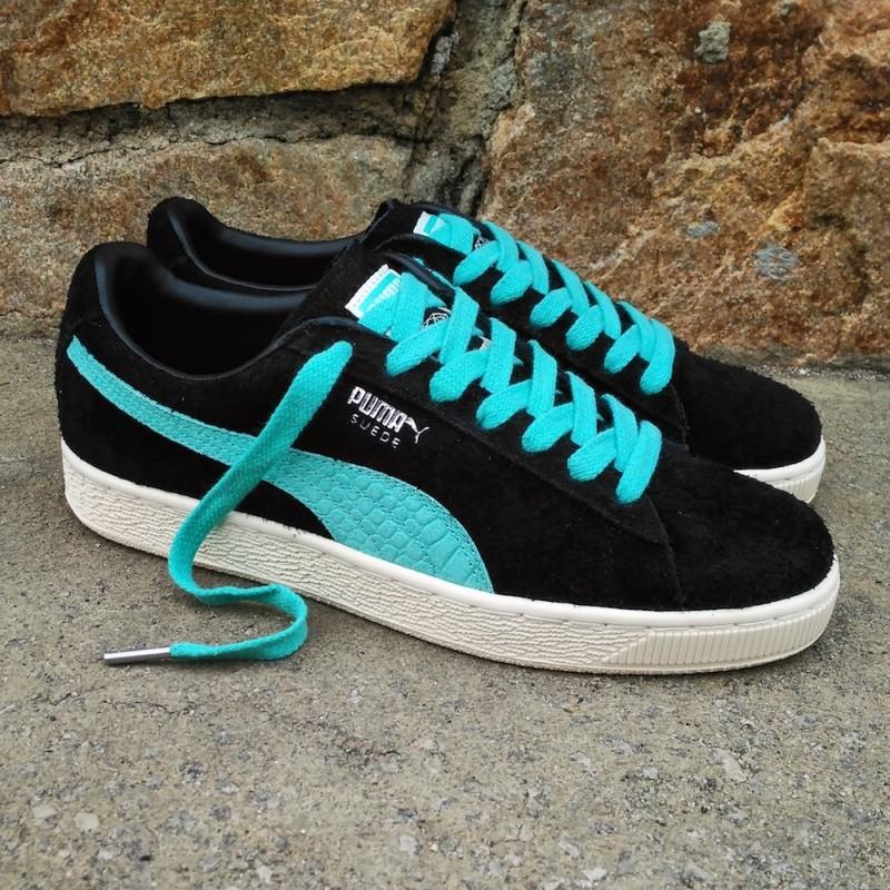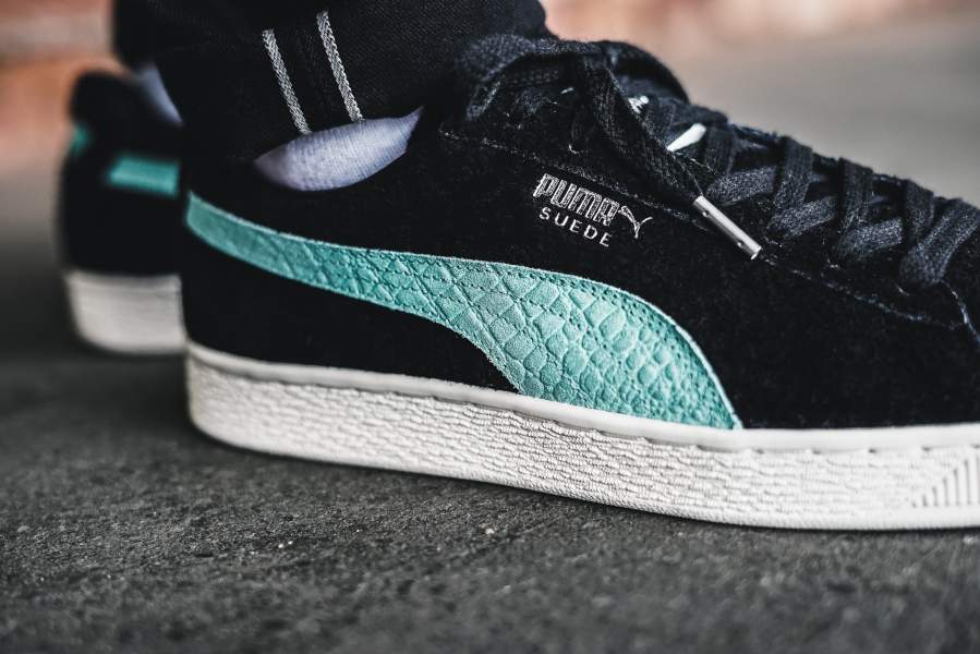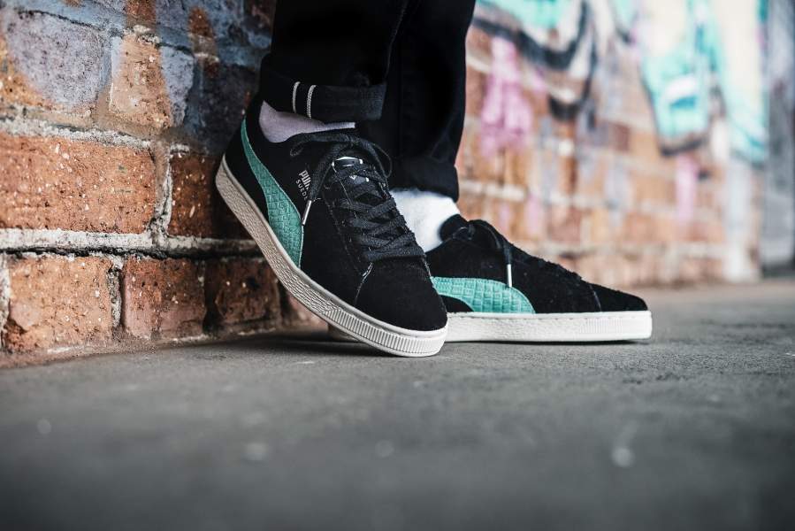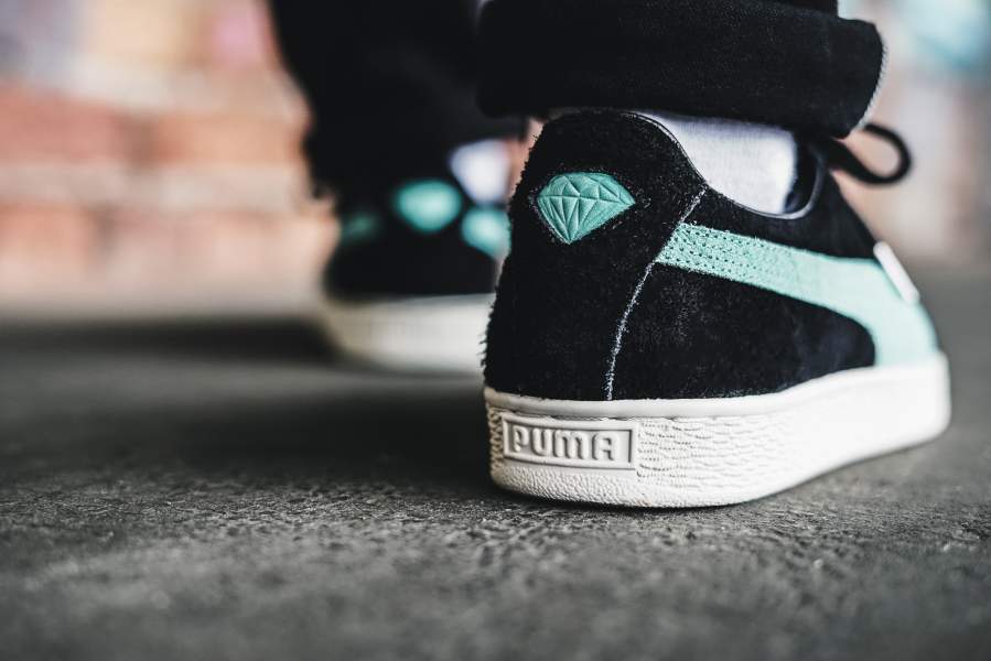Не первая коллаборация PUMA и калифорнийского скейт-бренда Diamond Supply (пер.- поставка бриллиантов, алмазов). Модель Suede (пер.-замша) выполнена из черной ворсистой замши с контрастными полосами мятного цвета, так называемый Diamond blue — фирменный цвет алмазного бренда. Канонический полоски, кстати, украшены тиснением под кожу рептилии, что выгодно выделяет их на фоне обычных релизов. Окончательным подтверждением, что перед нами коллаборация, а не обычное издание, являются логотип Diamond Supply на языке и пятке. В комплекте два цвета шнурков, черные и мятные